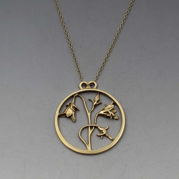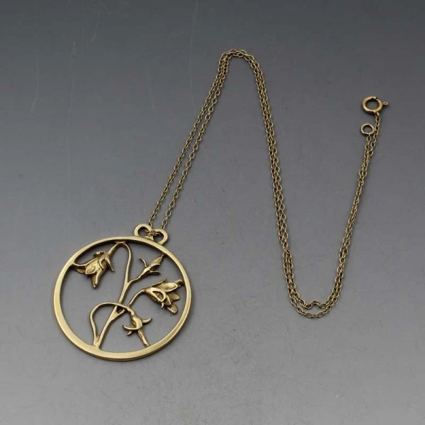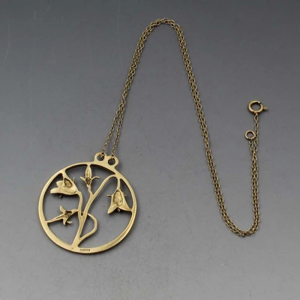 Norman Grant, Scotland, rare 9 carat gold floral pendant and chain. The rear of the pendant is marked "NG" and has 9 carat gold hallmarks, - the date year is slightly indistinct. The necklace has a 9 carat gold chain with a spring ring clasp. The chain measures approximately 18 inches (46 cm). The circular pendant of the necklace measures approximately 3.6 cm in diameter. The necklace is in very good condition. It is estimated to date from the 1970's.