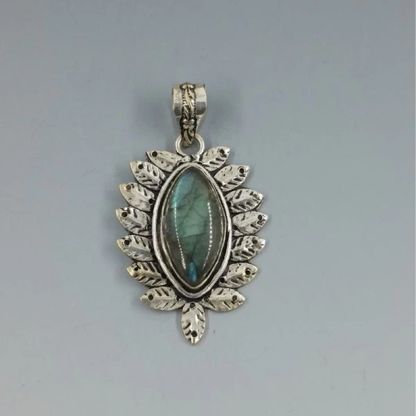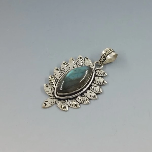 Oval vintage labradorite pendant. It comprises one oval labradorite stone bezel set in a decorative sterling silver setting with a sterling silver pendant bail. The rear of the pendant is marked "925" . It measures approximately 4 x 3 cm wide (not including the bail). Weight is 8.7 grams. It is in very good condition.