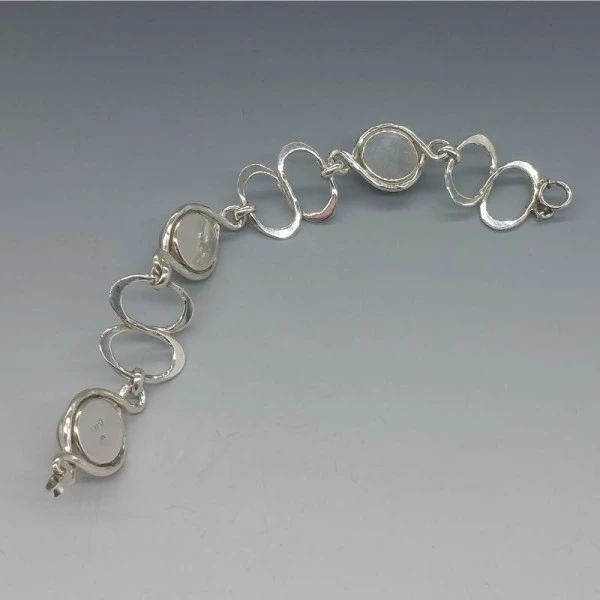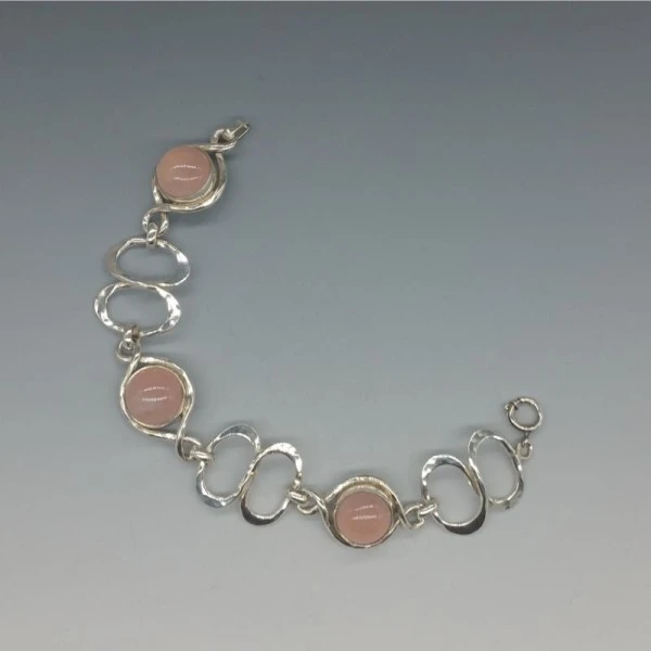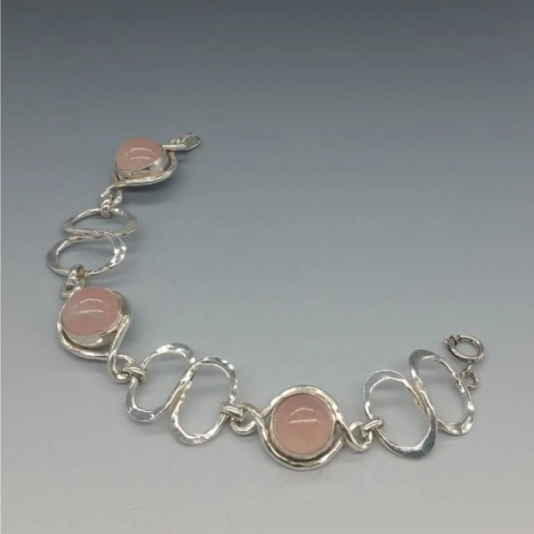 Beautiful vintage 1970's PERLI, Germany, bracelet. It has lovely quality pink rose quartz cabochons bezel set in 800 silver settings with oval shaped textured flat silver links. It has a spring ring clasp closure. It is signed "Perli" and "800" on the rear. The bracelet measures approximately 7.5 inches (19cm). Weight is 31.7 grams. It is in very good condition Condition: Very good condition Colour/Gemstone: Rose Quartz Metal: 800 silver Size: 7.5 inches (19 cm) Era: 1970'S