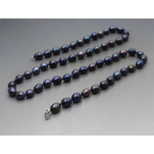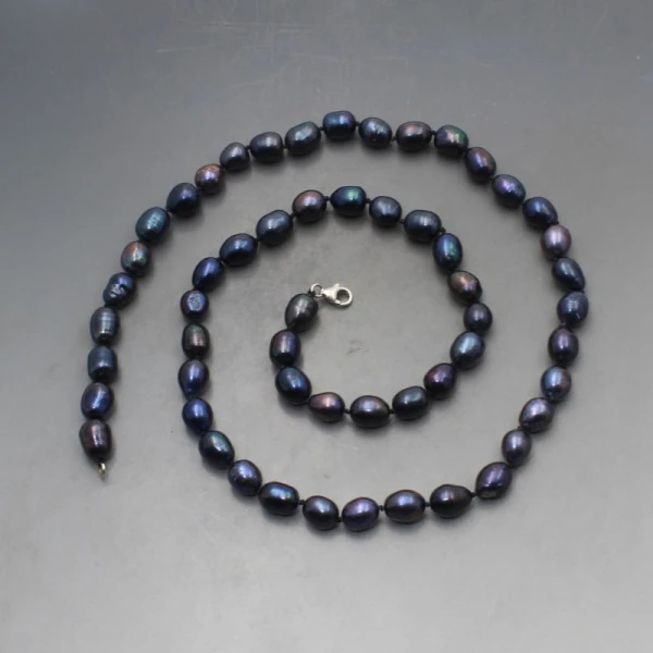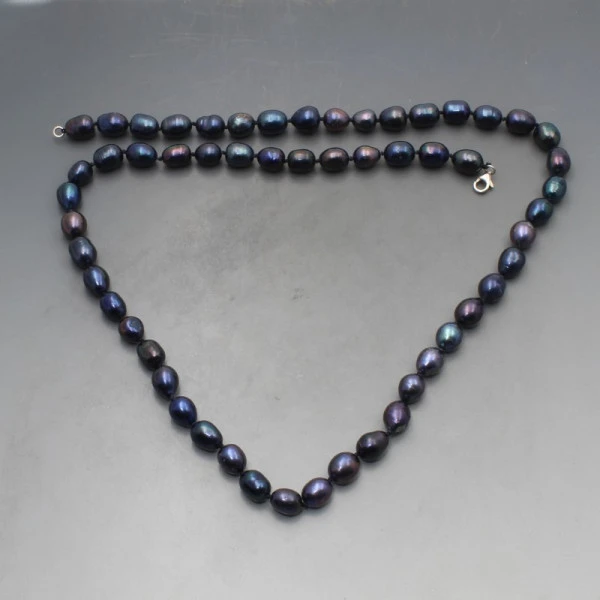 Vintage freshwater blue/black peacock pearl necklace. It measures approximately 61 cm (24 inches) long.The beads each measure approximately 0.9 x 0.7 cm and are hand knotted in between each bead.The set has a sterling silver lobster clasp closure. Weight is 49 grams. They are in very good condition. Condition: Very good Colour/Gemstone: Blue/black freshwater pearls Metal: Sterling silver Size: Approximately 24 inches (61 cm) long Era: Estimated 1990's
