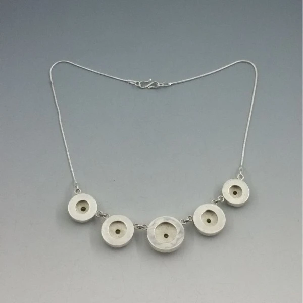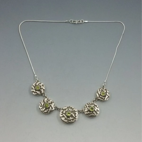 Beautiful vintage sterling silver modernist necklace . It has 5 solid silver circle links with textured raised effect . Each circle has a central sparkling peridot gem. The necklace has a smooth silver snake chain with hook clasp closure. It measures approximately 16.8 inches (43cm) long. The diameter of the largest silver circle is approximately 2.2 cm. The necklace is marked "925" on the rear and also on the chain. Weight is 27.8 grams. It is in excellent condition.