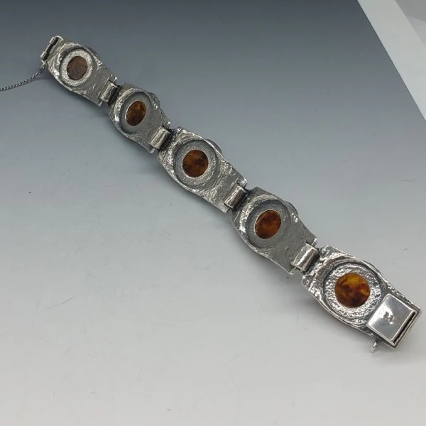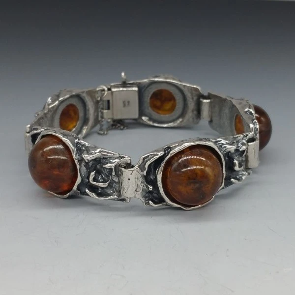 Stunnning vintage modernist PERLI, Germany, amber link bracelet. It has beautiful large amber cabochons bezel set in sterling silver settings. The links have a textured effect. It is signed "pe" and "925" on the rear and has a box clasp closure with safety chain. The bracelet measures approximately 7.5 inches (18.5 cm). Weight is 60.2 grams. It is in very good condition. Condition: Very good condition Colour/Gemstone: Amber Metal: Sterling Silver Size: 7.5 inches (18.5 cm) Era: 1970'S