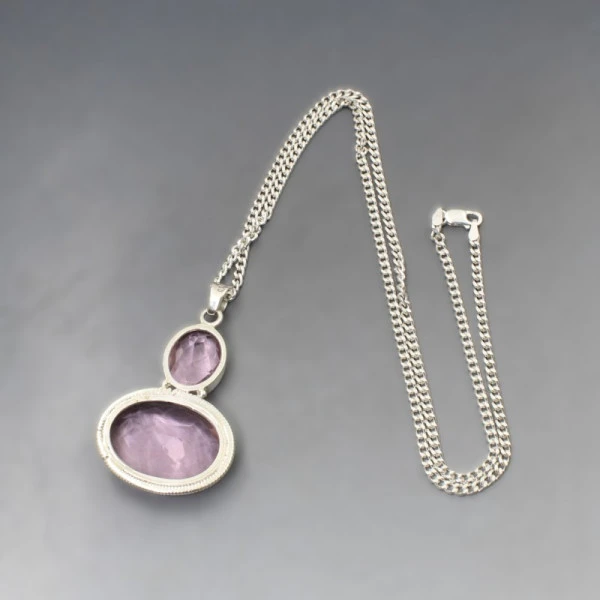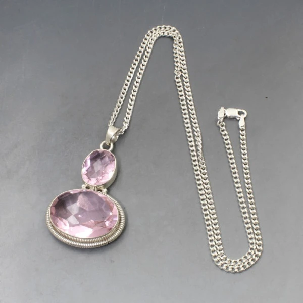 Vintage chunky pink quartz and sterling silver pendant. The faceted pink quartz cabochons are bezel set in open backed oval sterling silver settings.The necklace has a sturdy sterling silver cub chain with lobster clasp closure and pendant bail. The necklace is marked "925". The pendant measures approximately 4.2 x 3.2 cm (not including the bail) and the chain is approximately 51 cm (20 inches ). Weight is 23 grams . It is in very good condition. Condition: Very Good