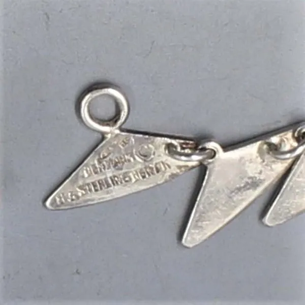 Vintage Hans Hans, Denmark, modernist sterling silver "Peak" bracelet design #238 . It was designed for Hans Hansen by Bent Gabrielsen in 1958. It has 6 silver links and a hook type clasp closure. It is signed "Hans Hansen, 925S Denmark". It also has sponsors mark "D..