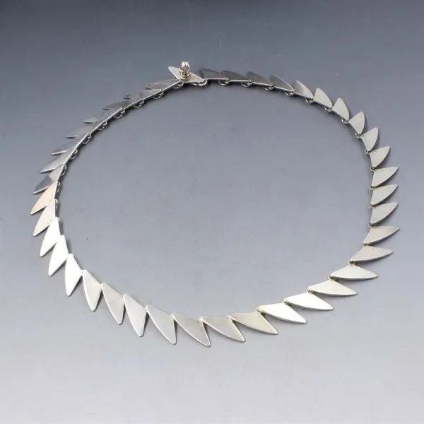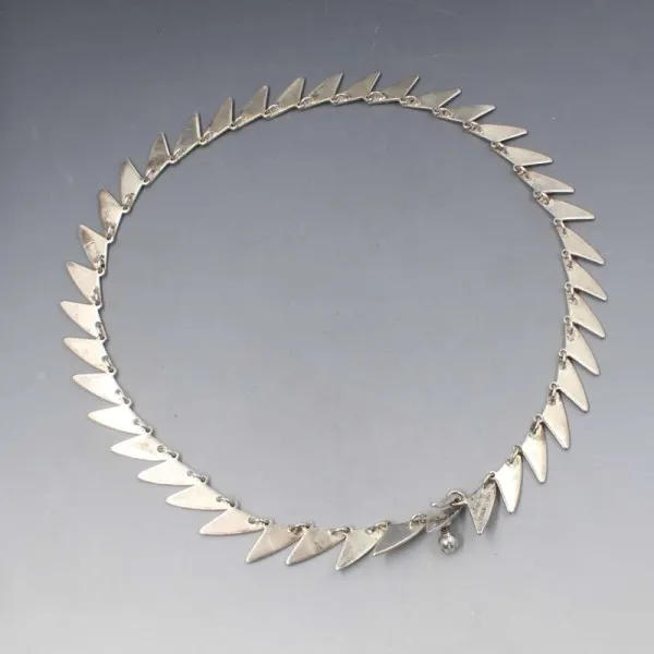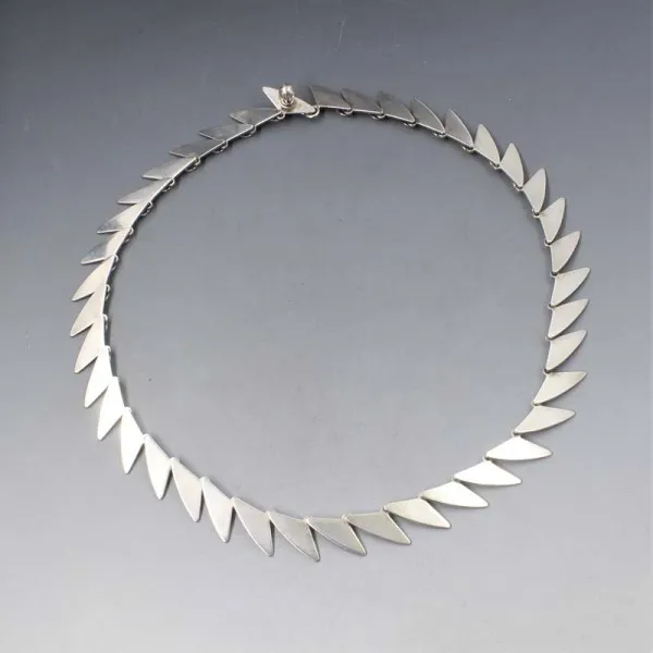 Rare and beautiful Bent Knudsen, Denmark, vintage modernist silver necklace #83. The necklace has a series of small silver fins with a silver hook type closure. It is signed "83 STERLING BENT K" and also has silver import hallmarks for London 1973. It measures approximately 15.5 inches (39.5 cm). Weight is 23 grams. It is in very good condition.