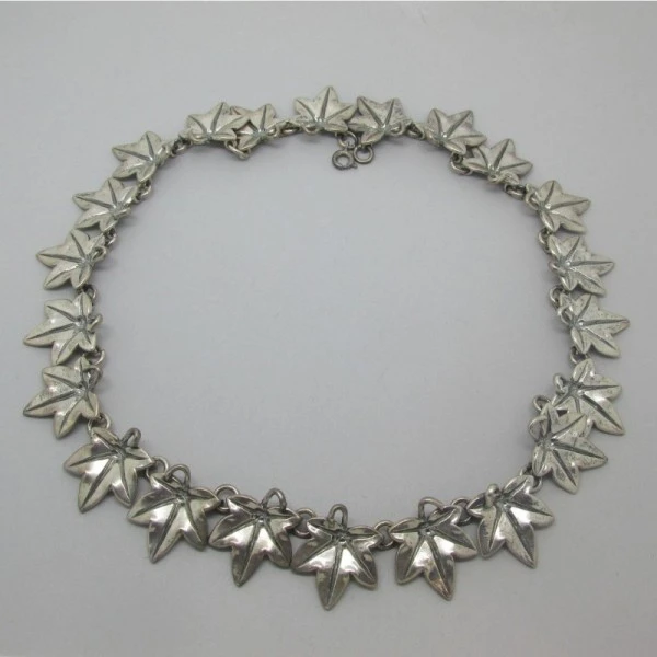 Beautiful vintage Eiler and Marloe, Denmark, 830 silver necklace #766. It has a series of 830 silver leaf design links and has a hook clasp closure. It it signed "830S, E&M, 766" and has the "EM" makers mark signature. Weight is 45 grams. It measures approximately 41 cm (16 ..