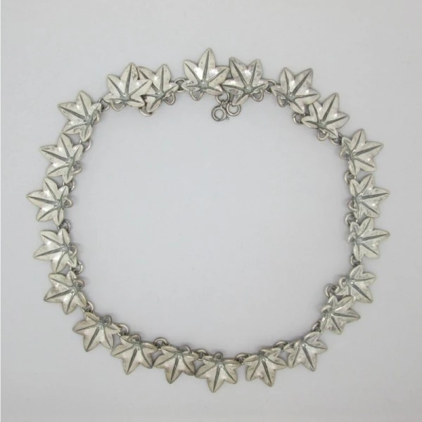 Elegant and rare sterling silver necklace by Bernard Instone. The provenance of this necklace can be traced to the Instone family. It comprises a series of connecting sterling silver leafs and it has a spring ring clasp closure. It has English hallmarks on the rear of the necklace for Birmingham 1969 -70 with makers mark BI for Bernard Instone .The necklace measures approximately 15.75 inches (40 cm).Weight is 50g. It is in good vintage condition with no damage just wear commensurate with age and light use. A matching bracelet is available - click here. Necklace and bracelet can be bought together - click here
