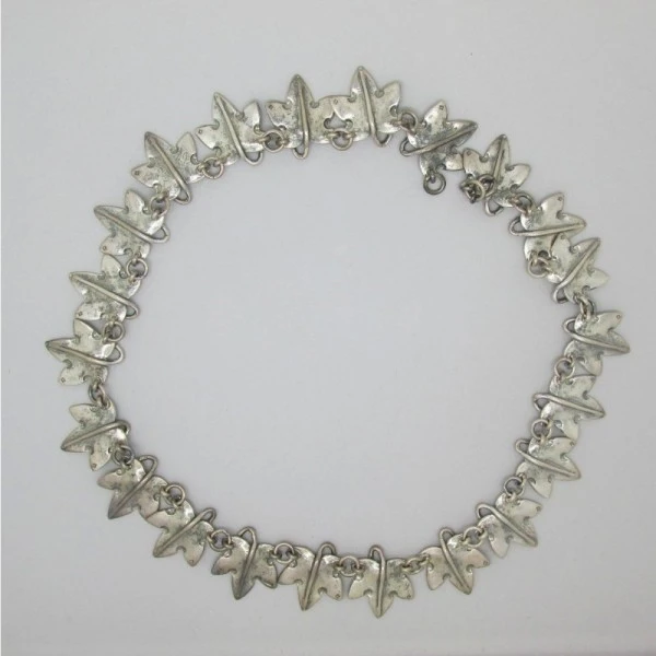 Beautiful vintage designer sterling silver modernist necklace with silver leaves design. The necklace measures approximately 16 inches (41 cm) long x 1.3 cm wide (at the widest part) and has a lobster clasp closure. Weight is 31 grams. The necklace is marked "925" and has indistinct makers mar..