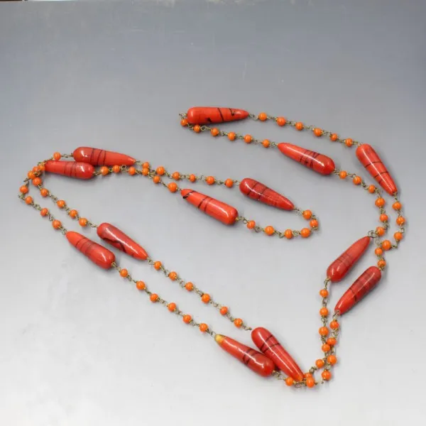Vintage set long red art deco style glass beads. The slim red glass beads have black stripes and are set on a gold tone chain with small orange/red beads in between the larger beads. The set measures approximately 42 inches (106 cm). Weight is 36 grams. They are in very good condition .