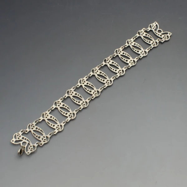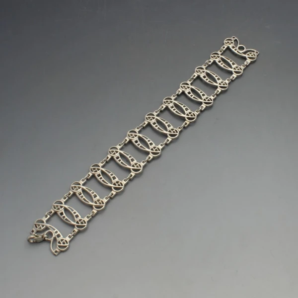 Vintage decorative Rennie Mackintosh Style sterling silver bracelet. It measures approximately 18 cm (7 inches) x 2.3 cm . Weight is 24 grams. It is marked "925". It in very good condition.