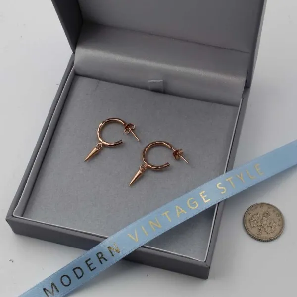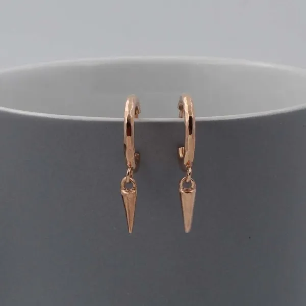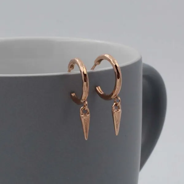 Rose gold vermeil hoop earrings with small spike drops. They have post and butterfly fittings suitable for pierced ears. The earring drop length (from the highest point of the ear wire) is approximately 2.4 cm. The spike drops measure approximately 0.9 cm long. The hoops measure approximately 1.5 cm in diameter. (Gold Vermeil is gold plated sterling silver.)