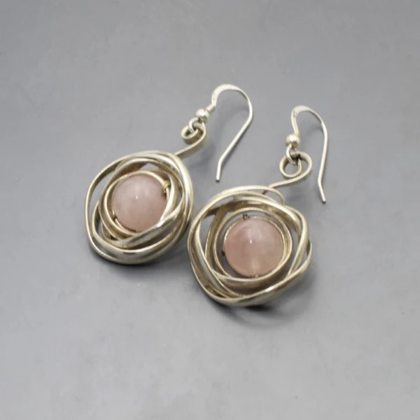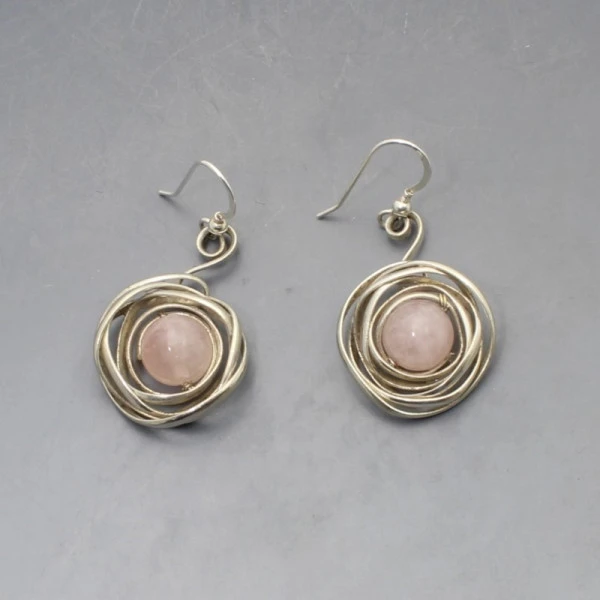 Lovely vintage artisan rose quartz and sterling silver earrings. The rose quartz gems are bezel set within circular silver wire details. The earrings have sterling silver hook earwires and are marked "925". Each earring measures approximately 2.2 cm in diameter (not including the ear wire). Total weight is 11 grams. They are in very good condition.