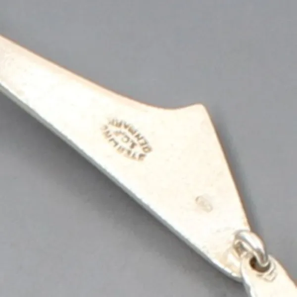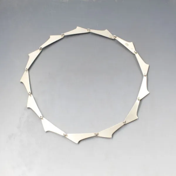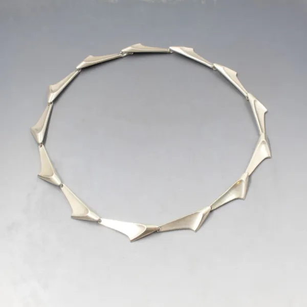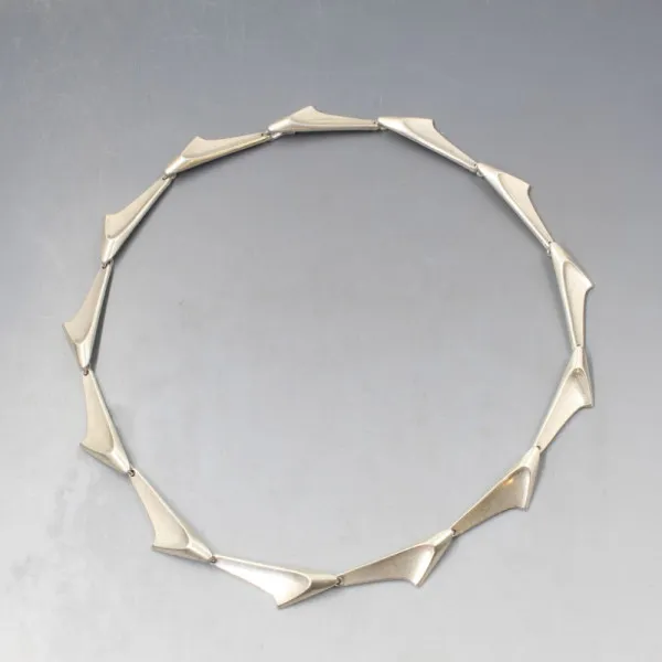 Beautiful and rare S Christian Fogh, Denmark sterling silver necklace. The necklace has a sleek modernist design with fin shaped sterling silver links and a hook clasp closure. It measures approximately 15.75 inches (40 cm). Weight is 33 grams. It is marked " STERLING SCF DENMARK" on the rear. It is very good condition. Estimated to date from 1950's to 1960's