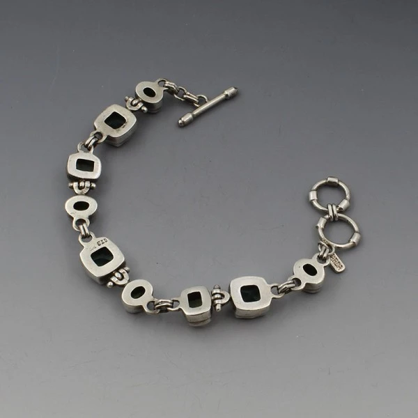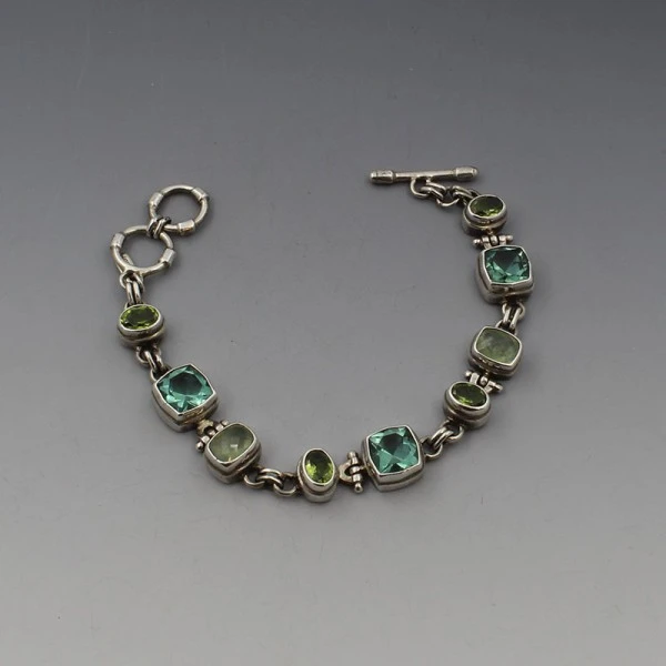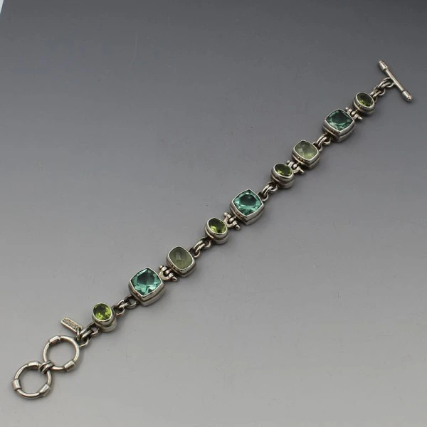 Pretty vintage SARDA moonstone, blue topaz, and peridot gemstone bracelet. The oval gems are bezel set in openbacked sterling silver settings.The bracelet is marked "SARDA" and "925" on the rear and measures approximately 7.5 inches (19 cm ). It has a sterling silver toggle clasp closure. Weight is 30 grams. It is in very good condition. Condition: Very good Colour/Gemstone: Moonstone, blue topaz, peridot Metal: Sterling Silver Size: 7.5 inches (19 cm) Era: