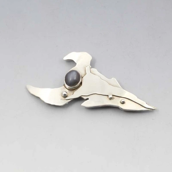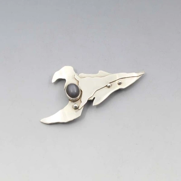 Sally Jane Ratcliffe silver modernist abstract brooch, one of her early works . It has an oval shaped labradorite gem bezel set in a sterling silver setting. It has a pin and rollover C clasp closure to the rear. It is signed "SJR" and has silver hallmarks for Sheffield 1990. The brooch measures approximately 7 cm x 3.7cm. Weight is 11.7 grams. It is in very good condition with small signs of wear commensurate with age.