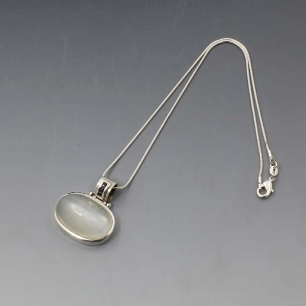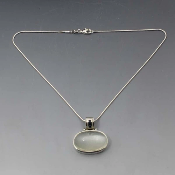 Beautiful vintage sapphire and moonstone pendant necklace. The oval shaped cats eye moonstone cabochon is bezel set in a sterling silver setting with small blue sapphires set in the silver bail above. The necklace has a 41 cm (16 inch) sterling silver snake chain with lobster clasp closure. The necklace is marked "925" for sterling silver on the rear. Weight is 19.0 grams. It is in very good condition.
