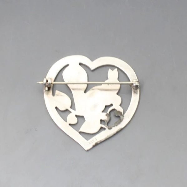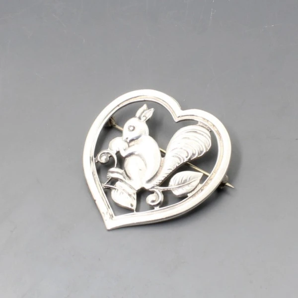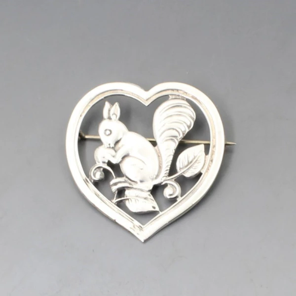 Vintage Scandinavian 830 silver squirrel brooch. The brooch features a squirrel in foliage set within a heart frame. It has a pin and C clasp closure to the rear. It is marked "830S" on the rear. The brooch measures approximately 4 x 4.4 cm. Weight is 11.8 grams. It is in very good condition with small signs of wear commensurate with age. Estimated to date from 1950's to 1970's.