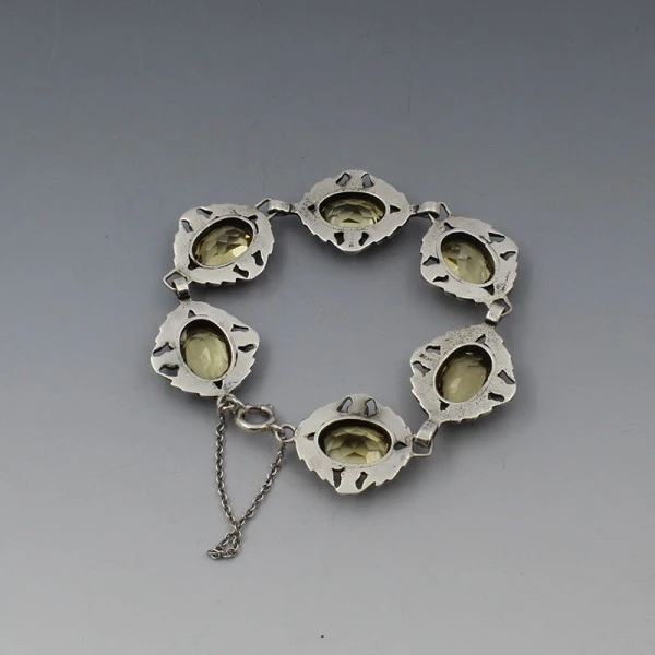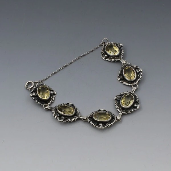 Beautiful vintage Scottish citrine and decorative sterling silver bracelet. Each of the six openbacked links has an oval shaped faceted citrine gem bezel set in a decorative thistle and leaves design setting. The bracelet measures approximately 7 inches (18 cm) . It is marked "SCOTLAND" and "SILVER" on the rear, and has a spring ring clasp closure with safety chain. Weight is 27.1 grams. It is in very good conditon. Condition:Very good Colour/Gemstone: Silver and citrine Metal: Sterling Silver Size: 7 inches (18 cm) Era: Estimated 1970's