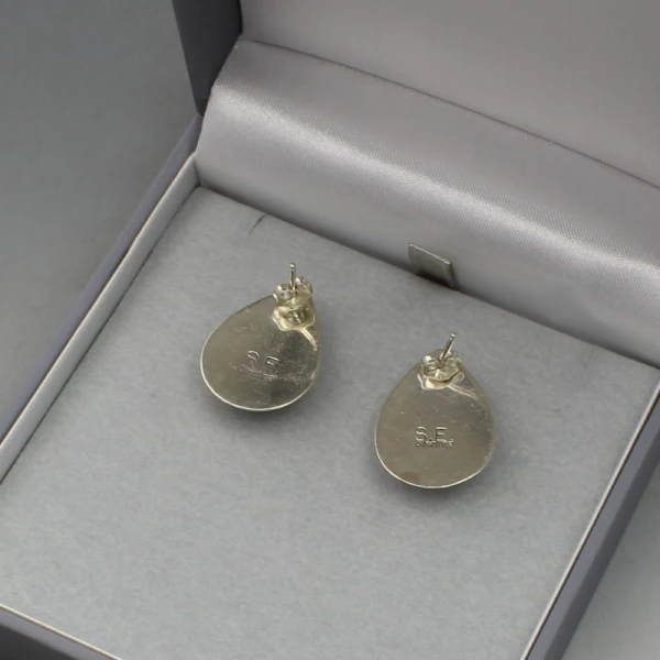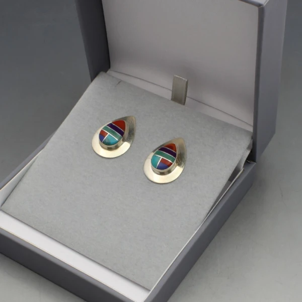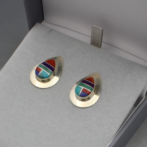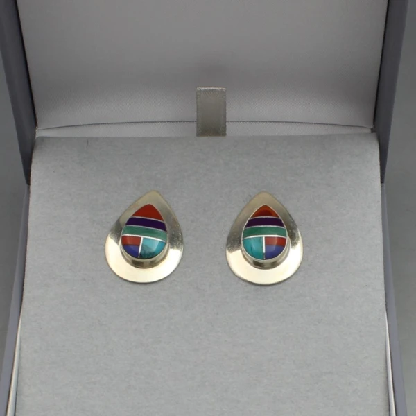 Lovely vintage designer Native American Zuni earrings by Sensa Eustace. The solid silver pear shaped earrings have post and butterfly fittings. The frontage is inlaid with multi colour stones including malachite, lapis, turquoise, and carnelian. The rear of the earrings are marked "SE" and "STERLING". Each earring measures approximately 2.4 x 1.7 cm Total weight is 5 grams. They are in very good condition.