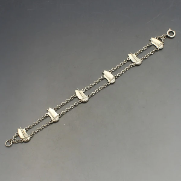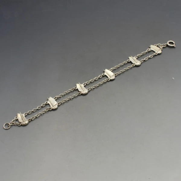 Vintage Shetland Silvercraft viking ship bracelet. The bracelet has 2 rows of sterling silver chains with 6 detailed flat viking ship links . It has a silver spring ring clasp closure and measures approximately 18 cm (7 inches) long x 1.4 cm wide. Weight is 9 grams. It has makers marks "SS" and silver hallmarks for Edinburgh 1966 on the rear. It is in very good condition with small signs of wear commensurate with age