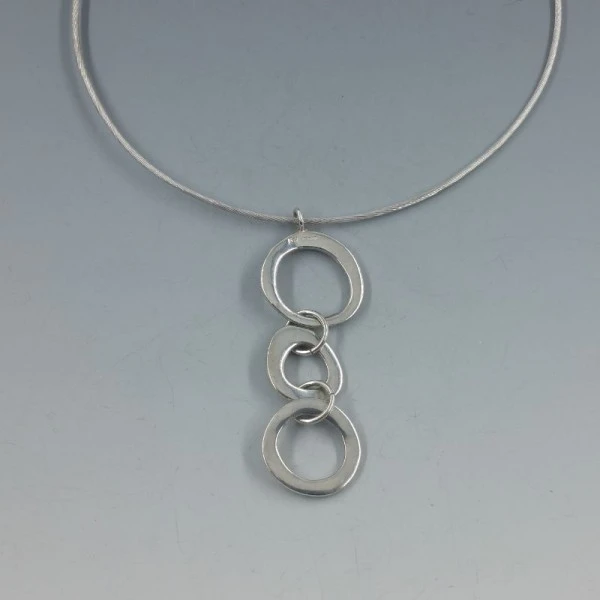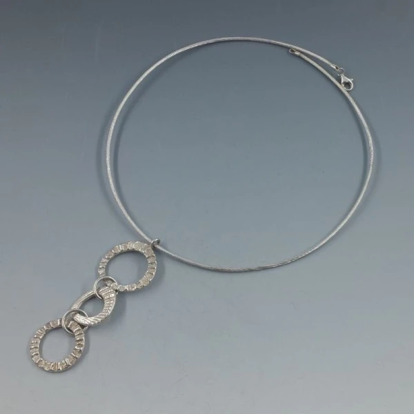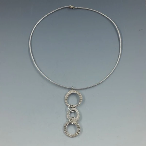 Rare Shimara Carlow one of a kind handmade silver modernist necklace. The pendant part has a textured finish and the collar has a smooth silver finish. The collar part measures approximately 16 inches (41 cm) and has a lobster clasp closure. The pendant measures approximately 6.5 x 2.2 cm wide (at the widest part). It is marked "SC" and "925" on the rear and has Edinburgh halllmarks for 2002. Weight is 13.0 grams. It is in very good condition.