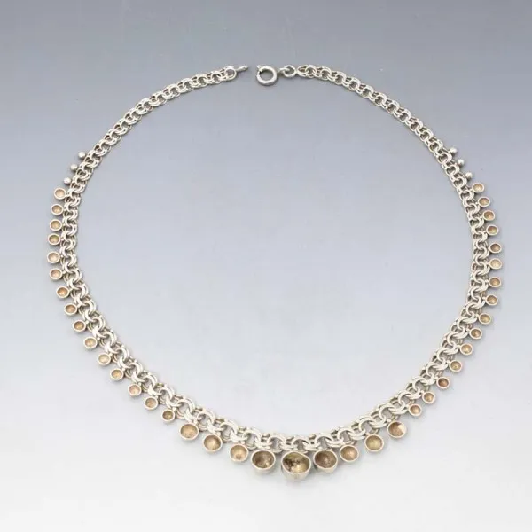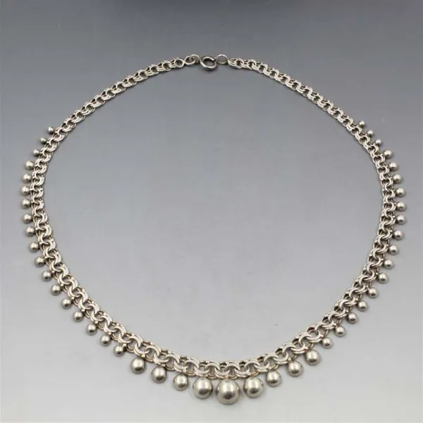 Beautiful and rare Herman Siersbol, Denmark, sterling silver modernist necklace. It has a detailed design with graduated small silver half ball details running along one side of a flat chain link area. The necklace measures approximately 17 inches, (44 cm) and has a silver spring ring clasp closure. Weight is 26.2 grams. It is signed " HS 925 S" on the clasp. It is in very good condition.