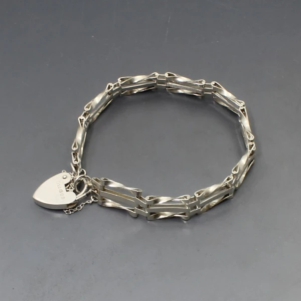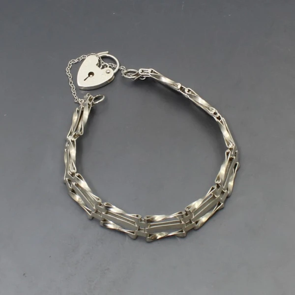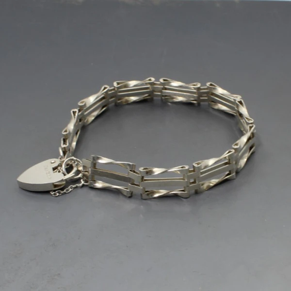 Vintage sterling silver gate bracelet with heart padlock closure .The bracelet measures approximately 18 cm (7 inches) Weight is 11 grams. It is signed with makers marks "ASJ", and has silver hallmarks for London 1977. It is in very good condition.
