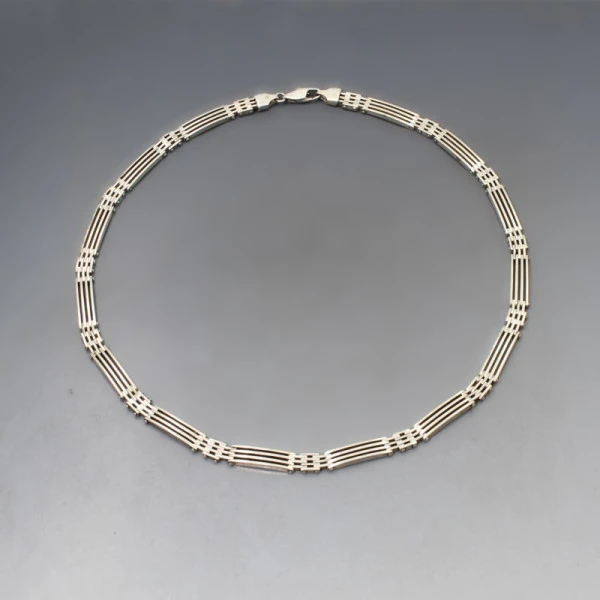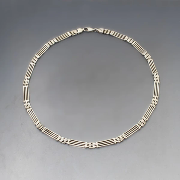 Vintage sterling silver Italian modernist link necklace. The necklace has decorative slim linear detail silver links with a lobster clasp closure. It measures approximately 16 inches (41 cm). Weight is 26 grams. It is marked " JL ITALY ", "925", and also has silver import hallmarks for London1987 . It is in very good condition. Condition: Very Good