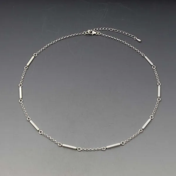 Silver bar and and chain necklace. It has a series of slim sterling silver bars on a sterling silver chain. The chain measures approximately 18 inches (46 cm) at full extension and is adjustable between 16 to 18 inches (41 to 46 cm).The chain is finished with a delicate silver charm. A long version of this necklace can be found here.