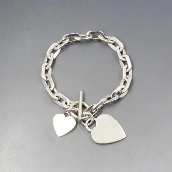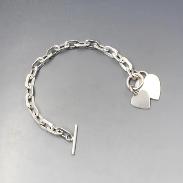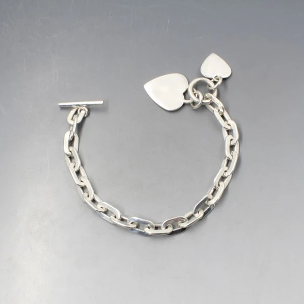 Vintage heavy sterling silver chain bracelet with silver heart tags. The bracelet measures approximately 19.5 cm (8 inches) and has a silver toggle clasp closure. Weight is 34 grams. It is marked "925" and is in very good condition. A matching silver necklace is available .