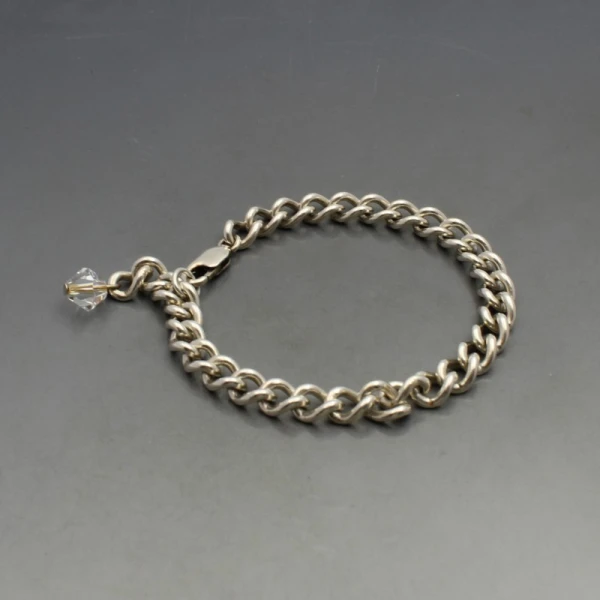 Vintage sterling silver chain bracelet with lobster clasp closure. It measures approximately 17.5 cm long (7 inches) x 0.6 cm wide. Weight is 21 grams. It is marked "925" and the chain is finished with a small clear crystal. It is in very good condition.