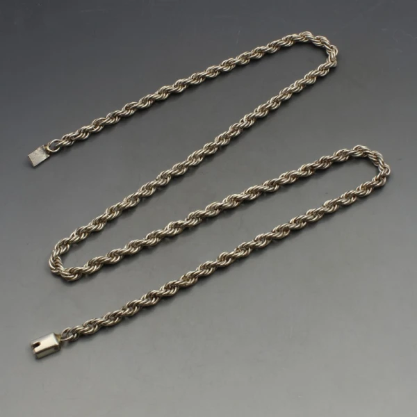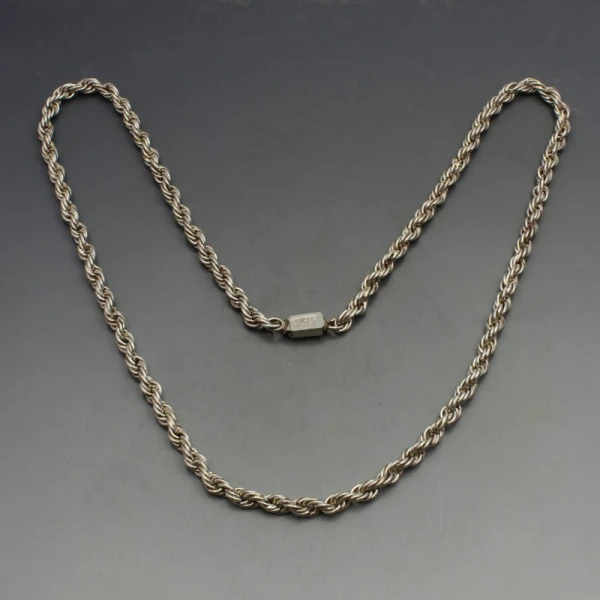 Vintage sterling silver chain necklace with box clasp closure. It measures approximately 24 inches ( 61 cm ) x 0.5 cm wide. Weight is 43 grams. There are indistinct silver marks on the clasp. It is in very good condition.