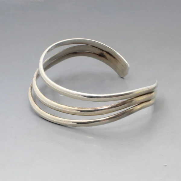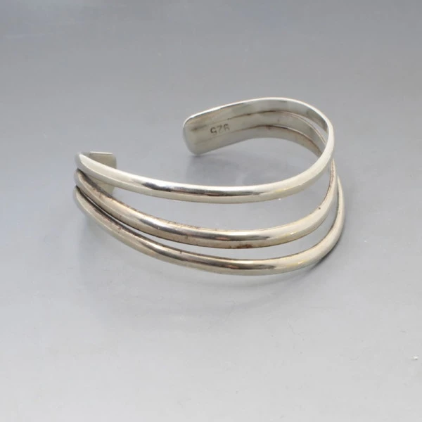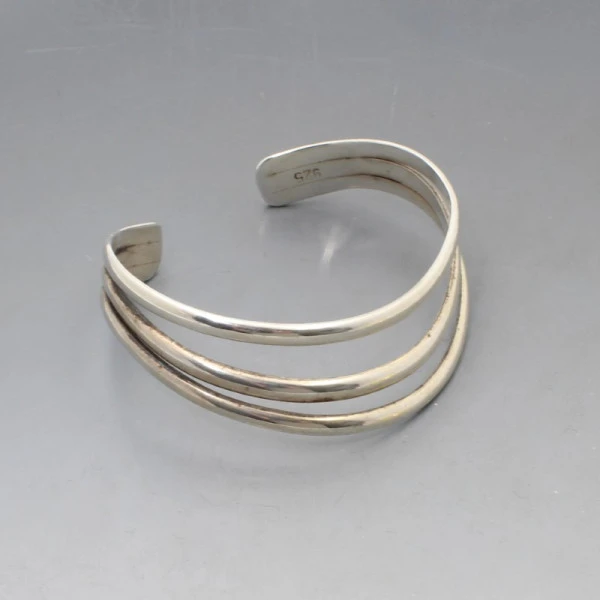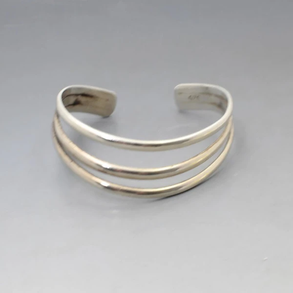 Vintage sterling silver cuff bangle. It measures approximately 5.8 x 4.8 cm (clear internal dimensions) . Width of frontage at widest part is approximately 1.8 cm.. It is marked "925", has indistinct makers marks, and has silver hallmarks for London 2001 on the inner side.. Weight is 23 grams. It is in very good condition with small signs of wear commensurate with age. .