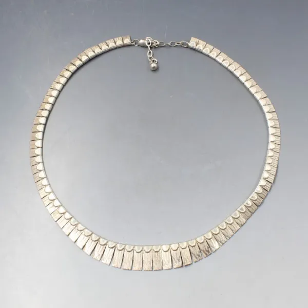 Vintage decorative sterling silver fringe necklace. It is marked 925 and has makers mark H.S on the rear. It has a silver lobster clasp closure and measure approximately 19 inches at full extension. It is adjustable between 17 to 19 inches (43 to 48 cm). Weight is 33 grams. It is in very good condition.