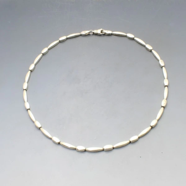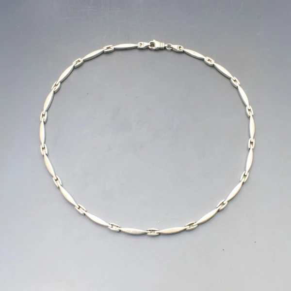 Vintage flat decorative sterling silver necklace. It measures approximately 16.5 inches (42 cm) long and has a silver lobster clasp closure. Weight is 34 grams. It is marked "925" and has indistinct makers marks. It is in very good condition.