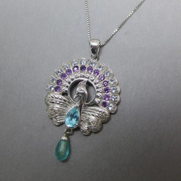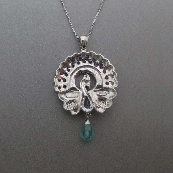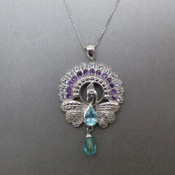 This vintage sterling silver pendant comprises a peackock design with small amethyst and aquamarine gemstone details. The pendant has a fine sterling silver chain with a spring ring clasp closure and is marked "925" on the rear of the pendant and the chain.The pendant measures approximately 3.3cm x 2.3cm . The sterling silver chain measures approximately 18 inches (46 cm).