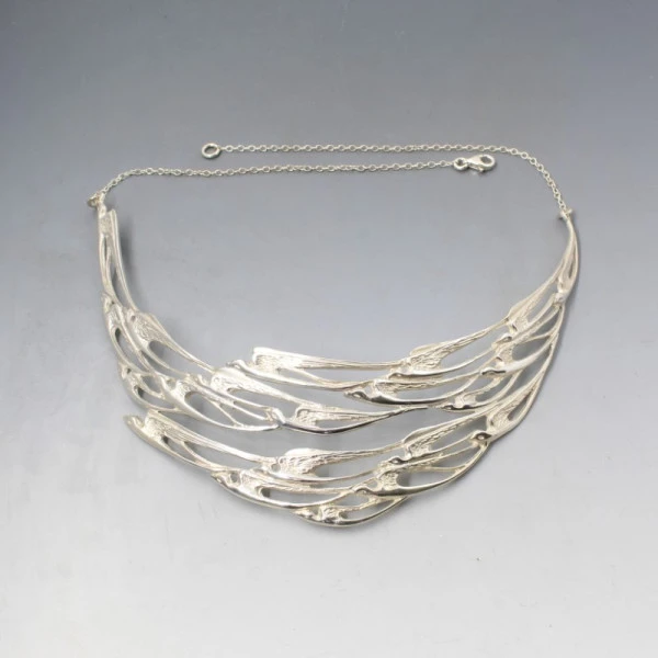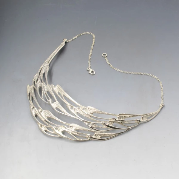 Beautiful pre owned sterling silver swallows necklace made by Celtic Art Industries inspired by a design of Peter Wylie Davidson. The necklace measures approximately 17 inches (43 cm) long and has a sterling silver chain and lobster clasp closure. The silver swallows part measures approximately 12.5 x 3.7 cm (at the widest points) ). Weight is 38 grams. It is marked "CA" for Celtic Art Industries and has silver hallmarks for Edinburgh 2012 on the rear. It is in very good condition .