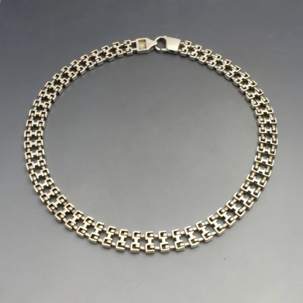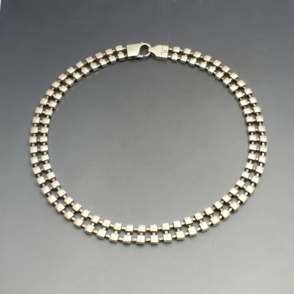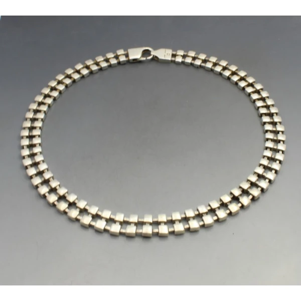 Vintage decorative Italian heavy sterling silver necklace. It has 2 linked rows of small solid sterling silver squares and a decorative sterling silver lobster clasp closure. The necklace measures approximately 16 inches (41 cm) x 1.2 cm wide. Weight is 84 grams. It is marked "925", "VI" and "Oa" on the rear and is believed to be of Italian origin. It is in very good condition with small signs of wear commensurate with age.
