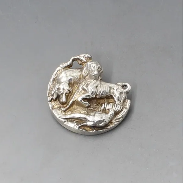 Lovely quality solid sterling silver hunting brooch.The silver brooch depicts two hounds and a pheasant and has a silver pin and rollover C clasp closure to the rear. It measures approximately 3 cm x 2.7 cm. Weight is 18 grams. It has makers marks "TGR"on the rear and silver hallmarks for London 1997. It is in very good condition.