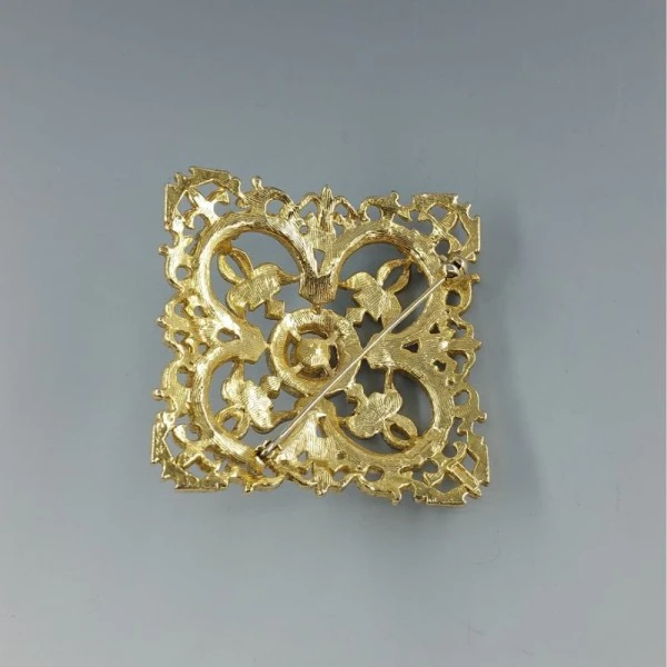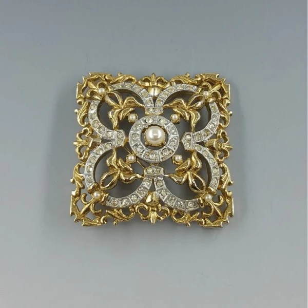 Condition: Very Good Colour:Gold and Silver, faux pearl and crystals Metal: Gold Tone Size: 5.3 x 5 Era: Estimated 1960's to 70's