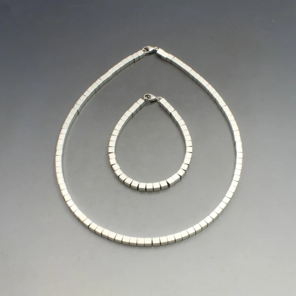 Vintage modernist sterling silver cubes necklace and bracelet set. The necklace and bracelet have a series of small sterling silver cubes and a lobster clasp closure. The necklace is a short round style necklace and measures approximately 15.75 inches, (40 cm) x 0.4 cm wide. Necklace weight is 30 grams. The bracelet measures approximately 7 inches (18 cm) x 0.4 cm . Bracelet weight is 13 grams. The set is in very good condition.