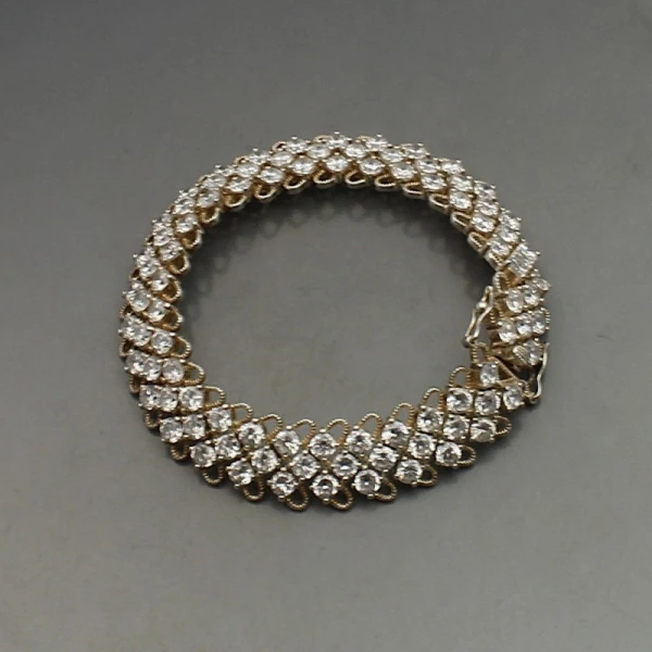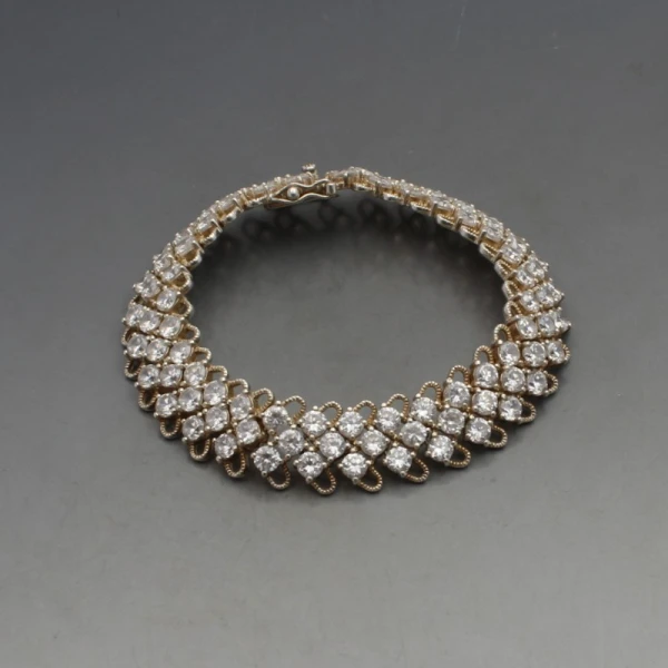 Vintage sterling silver and diamante crystal bracelet. The diamond shaped crystals are prong set within open backed sterling silver settings. The bracelet measures approximately 19 cm x 1.4 cm. It has a sterling silver box clasp closure with safety catch. Weight is 34 grams. It is marked "925" on the rear. It is in very good condition. Weight is 16 grams.