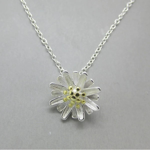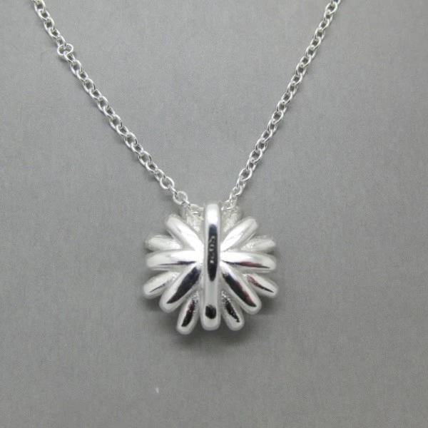 This is a dainty sterling vintage modernist silver flower pendant with lovely fine detailing. The pendant measures approximately 1.2cm in diameter.It has a 17 inch sterling (43cm) silver chain which is marked "925" and it has a lobster clasp closure. The rear of the pendant has indistinct markings , It may have Scandinavian origins, but this is unconfirmed. It is in excellent condition