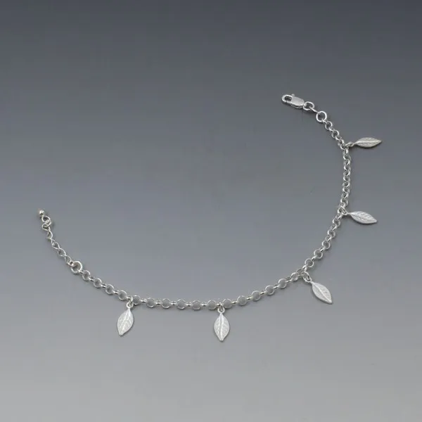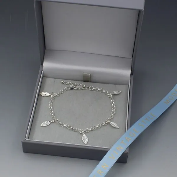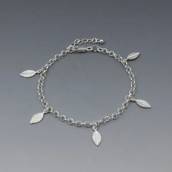 Pretty and versatile sterling silver leaves bracelet with delicate silver leaf details on a smooth sterling silver rolo chain with lobster clasp closure. The bracelet measures 16.5 cm and is adjustable by a further 5 cm to 19 cm. It can be fixed between 16.5 to 19 cm (6.5 to 7.5 inches).