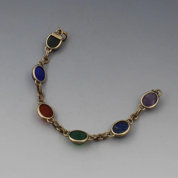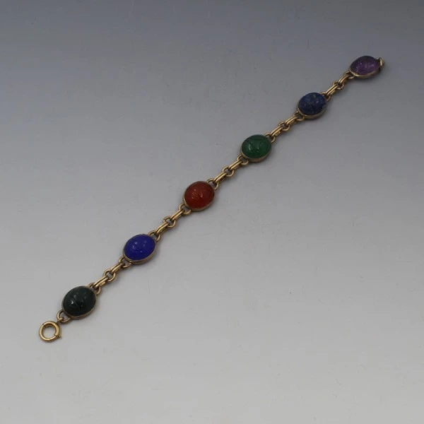 Handcarved 1940'S SYMMETALIC vintage multi gem bracelet . It has a mixture of lapis, chalcedony and amethyst oval gems bezel set in 14 carat gold plated sterling silver settings. The bracelet is marked "SYMMETALIC STERLING" on the rear and measures approximately 7 inches (18 cm ). Weight is 10.7 grams. It is in very good condition. Condition: Very good Colour/Gemstone: Multi gem Metal: Sterling Silver Size: 7 inches (18 cm) Era: 1940's