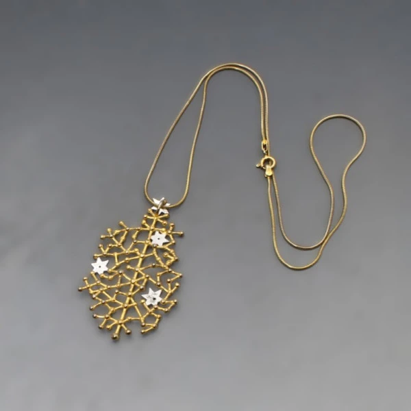 Vintage Tapio Wirkkala, Finland, gold vermeil and zircon starry sky pendant .The pendant was designed by Tapio Wirkkala for the Kultakeskus Oy workshop in Finland. It measures approximately 5.4 x 3.3 cm and has a 42 cm (16 inch) gold vermeil snake chain with lobster clasp closure. Weight is 11 grams. It is marked "925", has makers mark "TW" and also the Kultakeskus Oy workshop makers mark. It is in very good condition. Estimated to date from the 1990's.