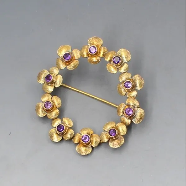 Condition: Very good Colour/gemstone :Gold and purple amethyst Metal: Gold Vermeil (Gold plated sterling silver) Size: 4.4 cm in diameter approximately Era: