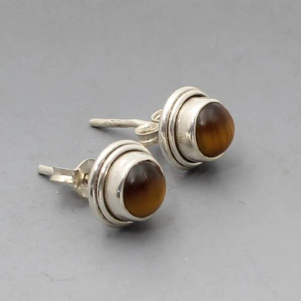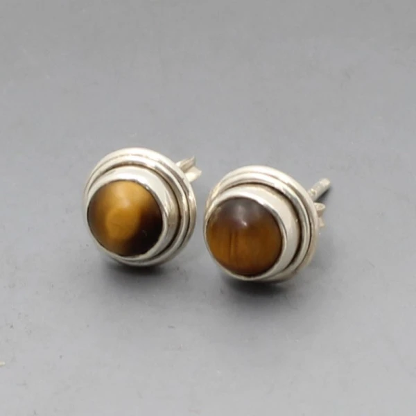 Lovely vintage tigers eye and sterling silver stud earrings. The earrings have sterling silver post and butterfly fittings. The tigers eye gems are bezel set in sterling silver settings. The earrings each measure approximately 1 cm in diameter. This is new old stock and they are in very good condition.