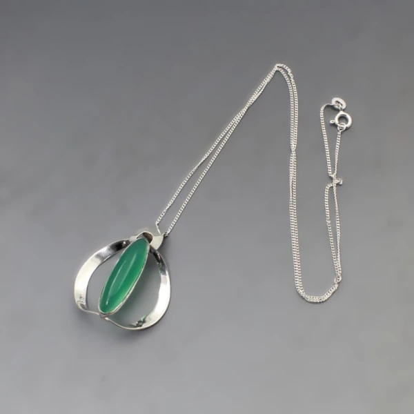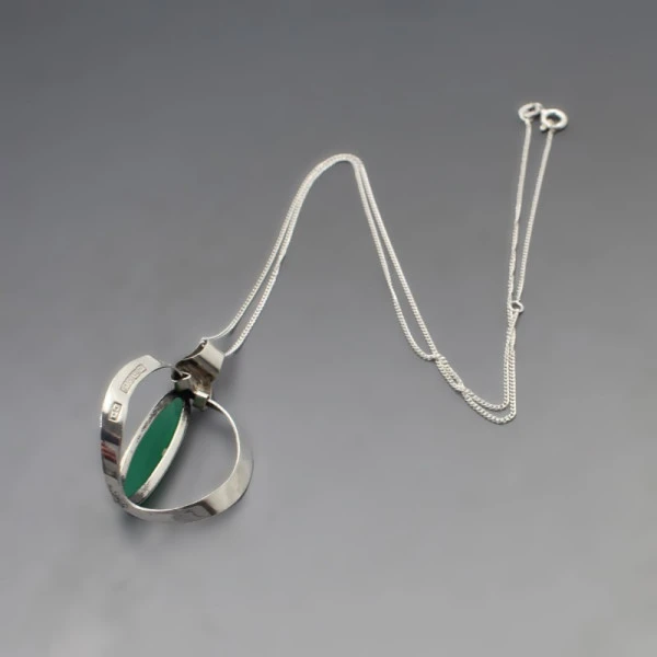 Vintage Turun Hopea , Turku Finland green chrysoprase and 813 silver modernist pendant. The oval green gem is bezel set in an open backed 813 silver pendant. The necklace has a 18 inch (45 cm) sterling silver chain (adjustable between 16 to 18 inches). Weight is 5 grams. It is signed with the Turun Hopea "TH" makers marks, "813H", the town mark for Turku and the Finland silver year date mark for 1966. It is in very good condition . Condition: Very Good Colour/Gemstone: Silver and green chrysoprase Metal: 813 silver Size: Adjustable 16 to 18 inches (41 to 45 cm) Weight: 5 grams Era: 1966