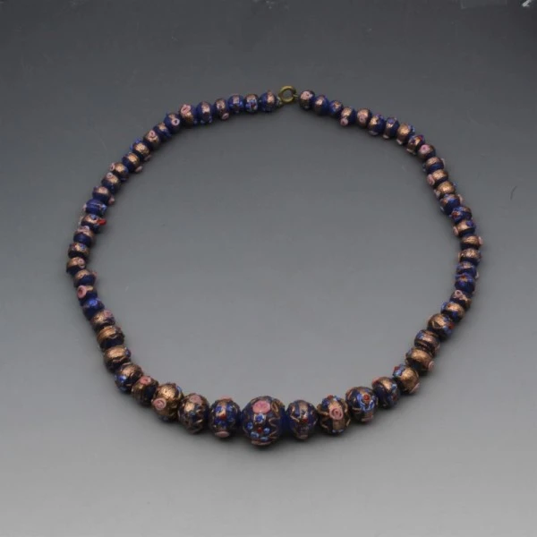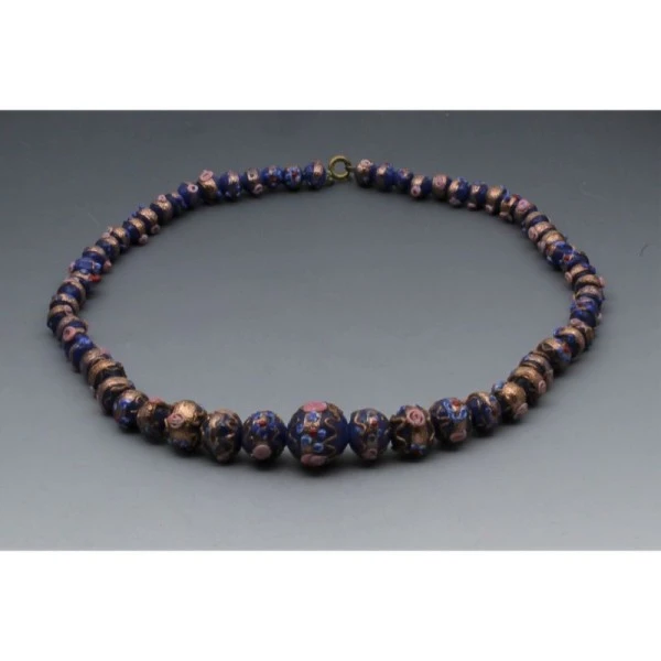 A set of graduated vintage Venetian glass wedding cake beads. This set has a lovely dark blue base colour with a mixture of pink, red and gold flowers and swirls. The necklace measures approximately 17 inches (43 cm) and has a gold tone spring ring clasp closure.The largest beads is approximately 1.4 cm in diameter. Weight is 48.1 grams. They are in very good vintage condition with only small signs of wear commensurate with age.